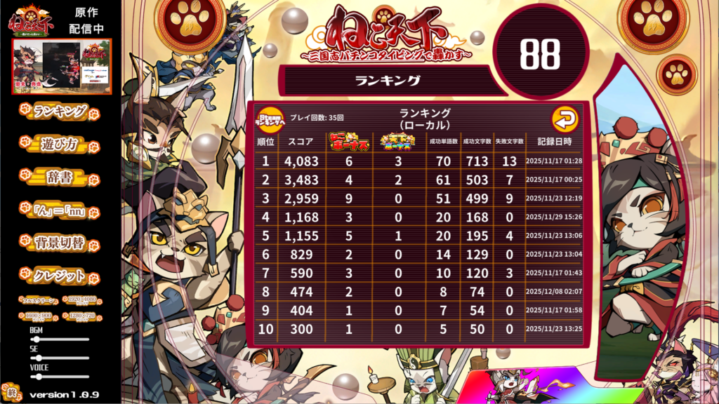 CenturyUU株式会社(本社:東京都千代田区)とゲーム制作・販売サークル「今川ソフト」は、三国志×タイピング×パチンコのゲーム『ねこ天下~三国志パチンコタイピングで轟かす~』』を2025年12月15日リリースしたことをお知らせします。