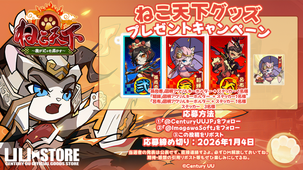 リリースを記念して『ねこ天下~三国志パチンコタイピングで轟かす~』のグッズの販売、及びプレゼントキャンペーンを実施します。